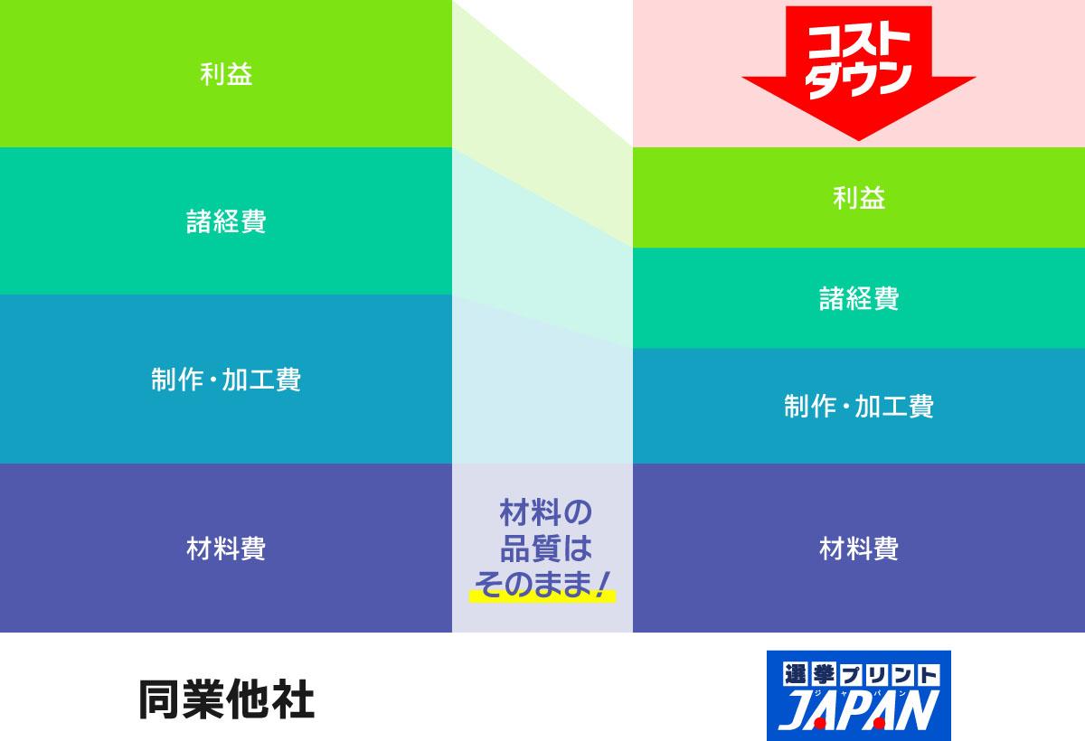 選挙プリントJAPANは、長年選挙関連事業に携わってきた経験を活かし、「印刷設備の自社導入」「効率運営の追求」による大幅なコスト削減を実現しました。一方、用品の品質に関わる材料費については過剰な削減を控え、高品質を維持しています。